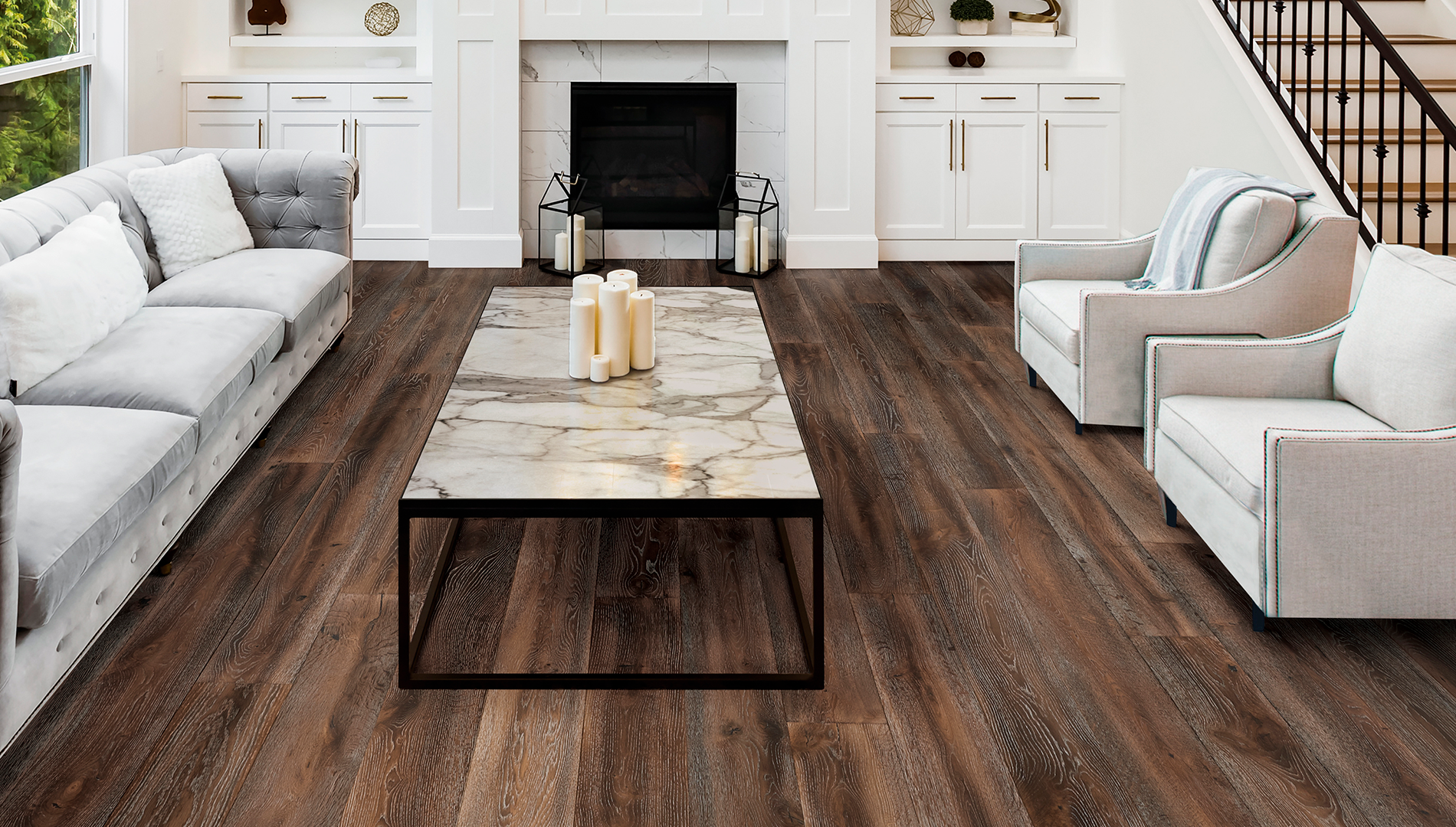This product contains color variation that ranges from light to dark planks. Wood is a natural product with inherent differences in color, texture and grain that may not be represented in this room scene.